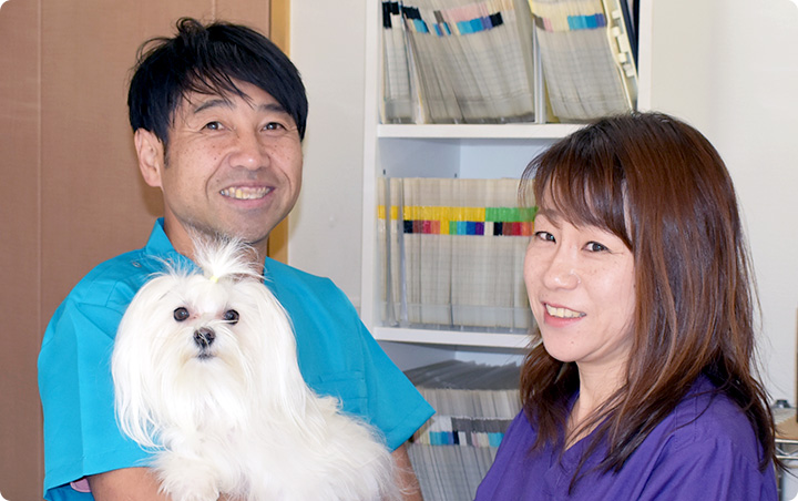 獣医師夫婦二人で皆様の大切なワンちゃん・ネコちゃんが飼い主様とより長く、快適に暮らせることを大事に考えて診療にあたっています。
